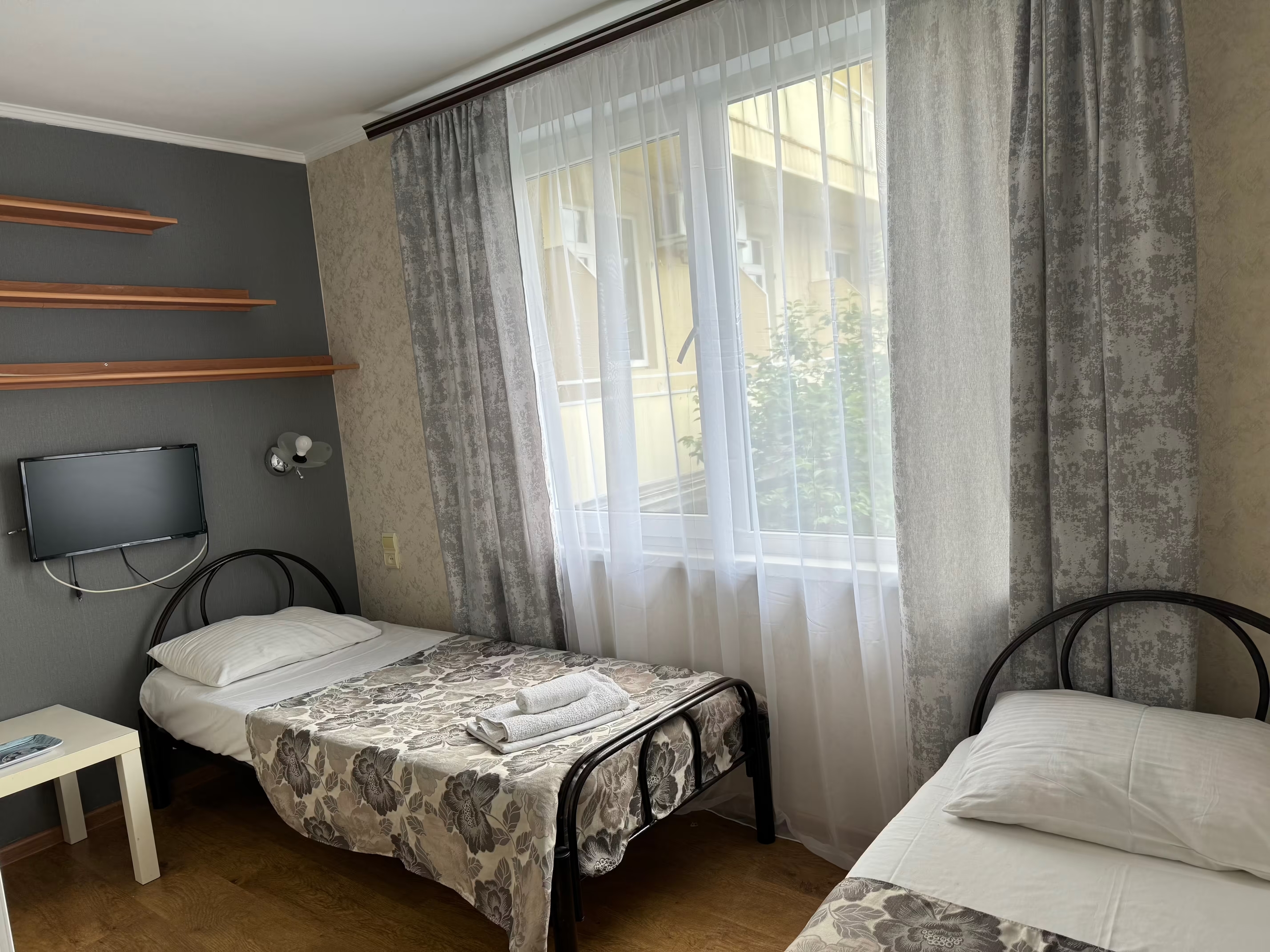 | Стандарт 2-местный с раздельными кроватями | 16 кв.м. | 2 чел. | Мебель (кровати односпальные, стеллаж, столик журнальный, стул), Оборудование (кондиционер, телевизо... | |